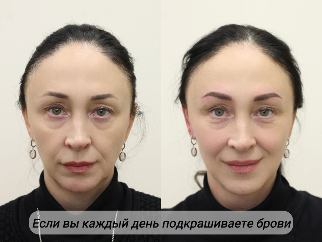 Делает перманентный макияж всех трех зон (брови, веки, губы).